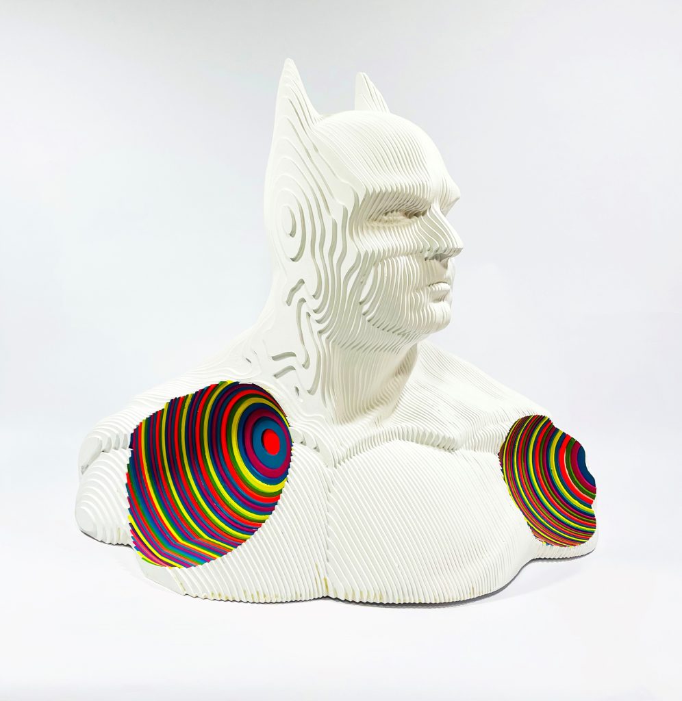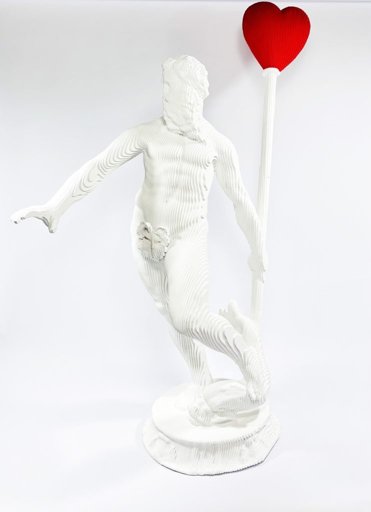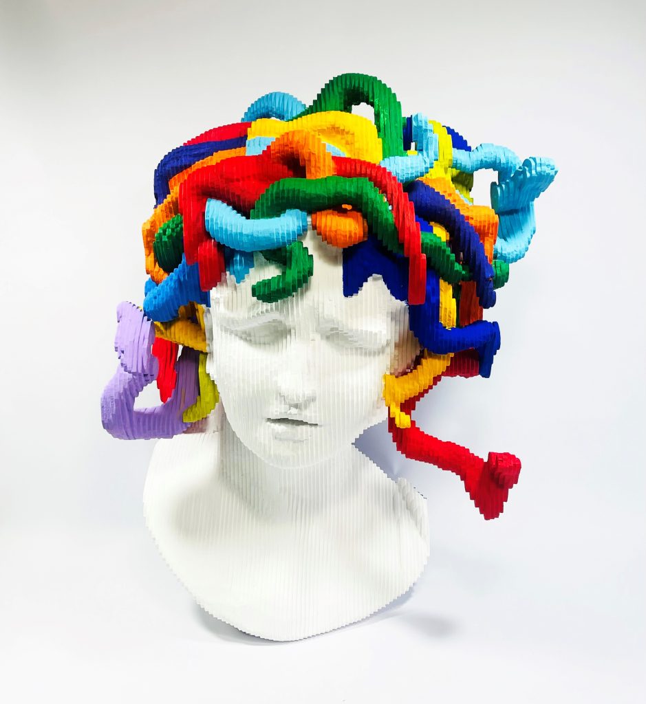 Italian artist Daniele Fortuna attempts to popularize the mythological figures he has admired since childhood by producing pixelated wooden sculptures, often painted in bright neon hues. After completing his studies at the European Institute of Design Milan, Fortuna began working for a lighting studio in Ireland where his experience working with wood inspired him to design sculptures with the material. His sculptures often depict gods and heroes from classical mythology; each composed of several hand-cut plywood boards that are assembled together and painted. Works from his “Colormination” series, such as Aphrodite Colorlamination (2021), are painted white on the exterior; a section of the sculpture is then spliced open to expose surprising kaleidoscopic color gradients on the inside.