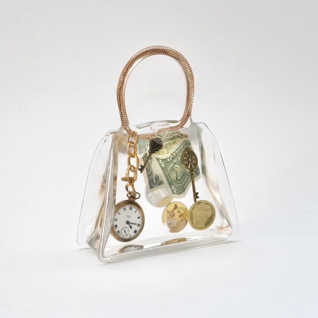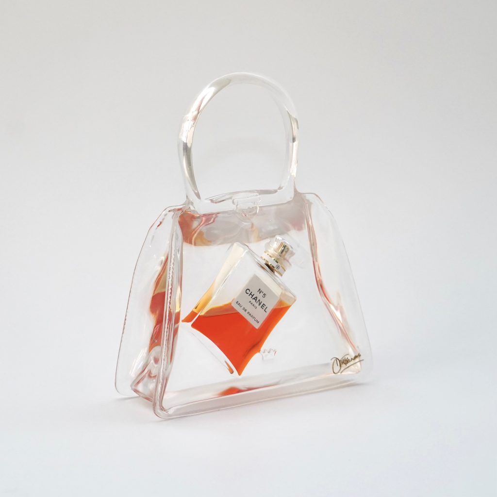 It was whilst she was at art school that the idea for Artbags first materialized. Debra took a beautiful handbag from a top couture house and adapted it into a silicone mould for casting. Whilst the first bag was sculpted in heavy white plaster, her next bag, ‘Catch’, was cast in resin and featured a goldfish inside a tank of water, mounted on a plinth. Her first pieces were highly autobiographical, as, through these, Debra visualized how she was feeling about various areas of her life. Her ideas now are to explore consumption and the complex relationship with material objects both as consumable fashion goods but also as harbingers of memories, love, and aspirations. With their kitschy elements, her works are a clear nod to pop art, brought into the digital age; now more than ever, how we curate and display the emblems that we love, and they, in turn, curate and display us. She has since lived and worked in New York, Europe and London, where she is now based.