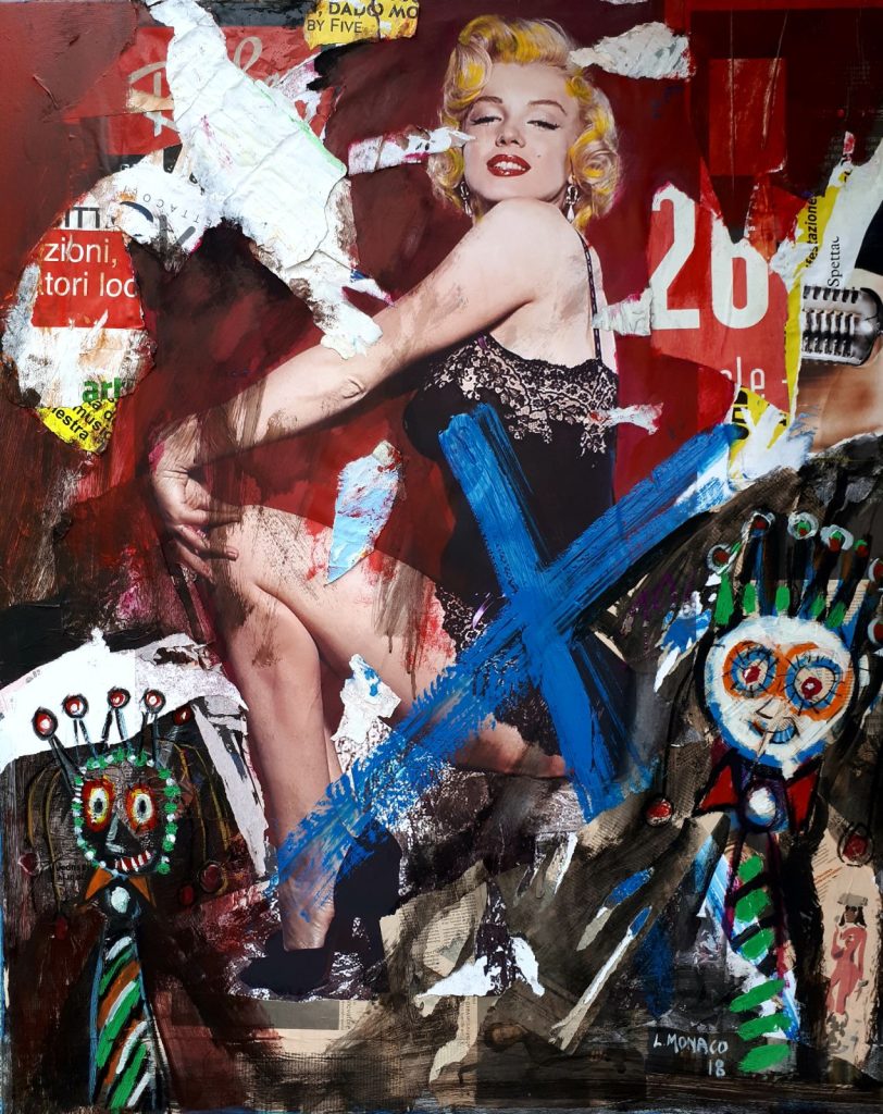 Monaco’s artistic research is influenced by Pop Art, but the artist developed his own style, giving his works a quiet personal taste. At first glance, his technique might be compared to Mimmo Rotella’s. Rotella, inspired by Pop Art, uses fragments, teared up posters in a cold and rational way for his canvas. However, Monaco follows his inner perceptions, deeply bound to his emotions, often inspired by famous movies, masterpieces of Cinema, which inspire the strong social message of his works. His subjects are commonly taken from cinema and comics, but also social events inspire him. In his works there is evidence of technique, balance in arrangements, chromatic combination and artistic sensibility. Lucio Monaco brought “realism” in the representation of our magmatic currentness. It doesn’t matter if his collages and tearings are similar to others, as his style stands out due to his passion for objects, but in particular art objects.