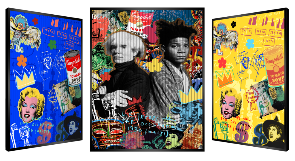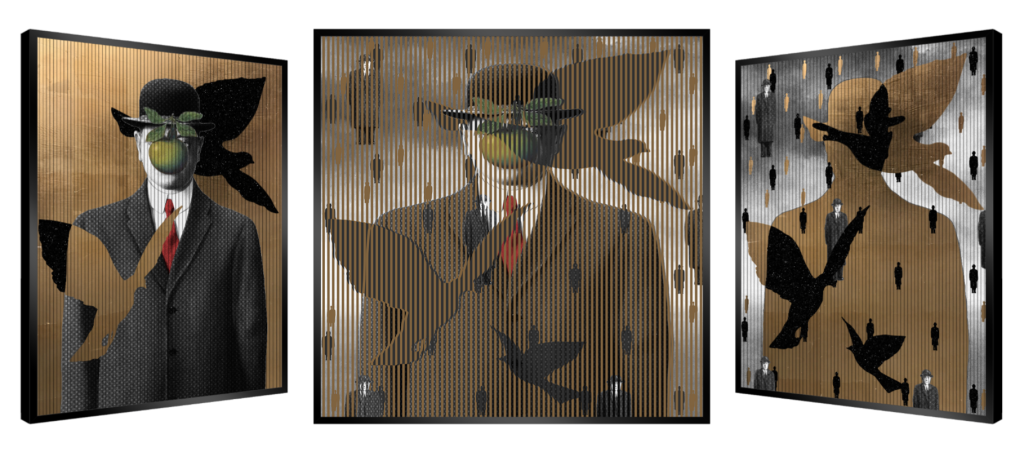 The Double Principle depicts the fusion of two images designed to blend into one. This newly merged image is applied on a medium in accordion configuration. The application on this medium recreates, at 45° angle, the two original images that can be seen from both sides. Several other images, revealed through interlacing of the two views, become visible as spectator moves around the artwork. The Triple Principle depicts three images, one central and two laterals. The side views are created by strips inserted perpendicular to the central image. Two distinct images are visible, from both sides at 45° angle. This technique allows visual variations when the spectator moves around the work, while maintaining defined sight of the central image. The result of these two techniques is captivating, giving the artworks an animated and perpetually renewed aspect. The movement is not the only element that affects visual variation, but the light direction and intensity also contribute to the artwork’s kinetic effect.