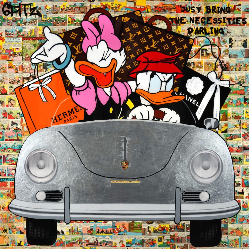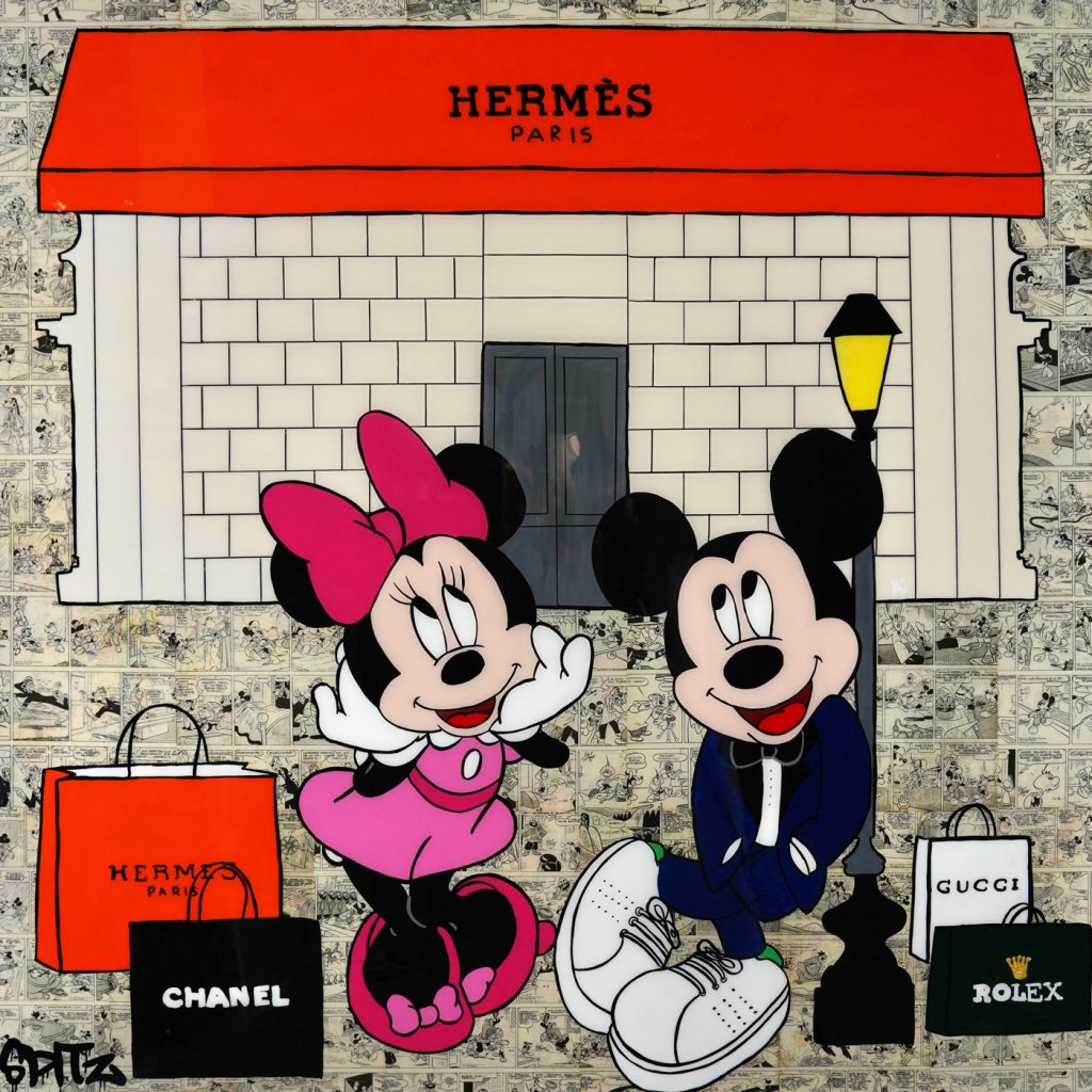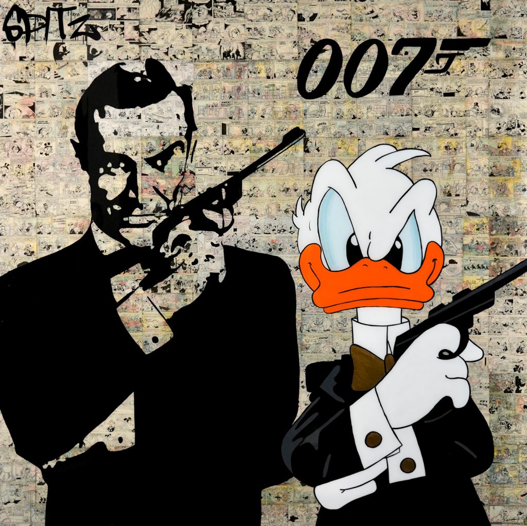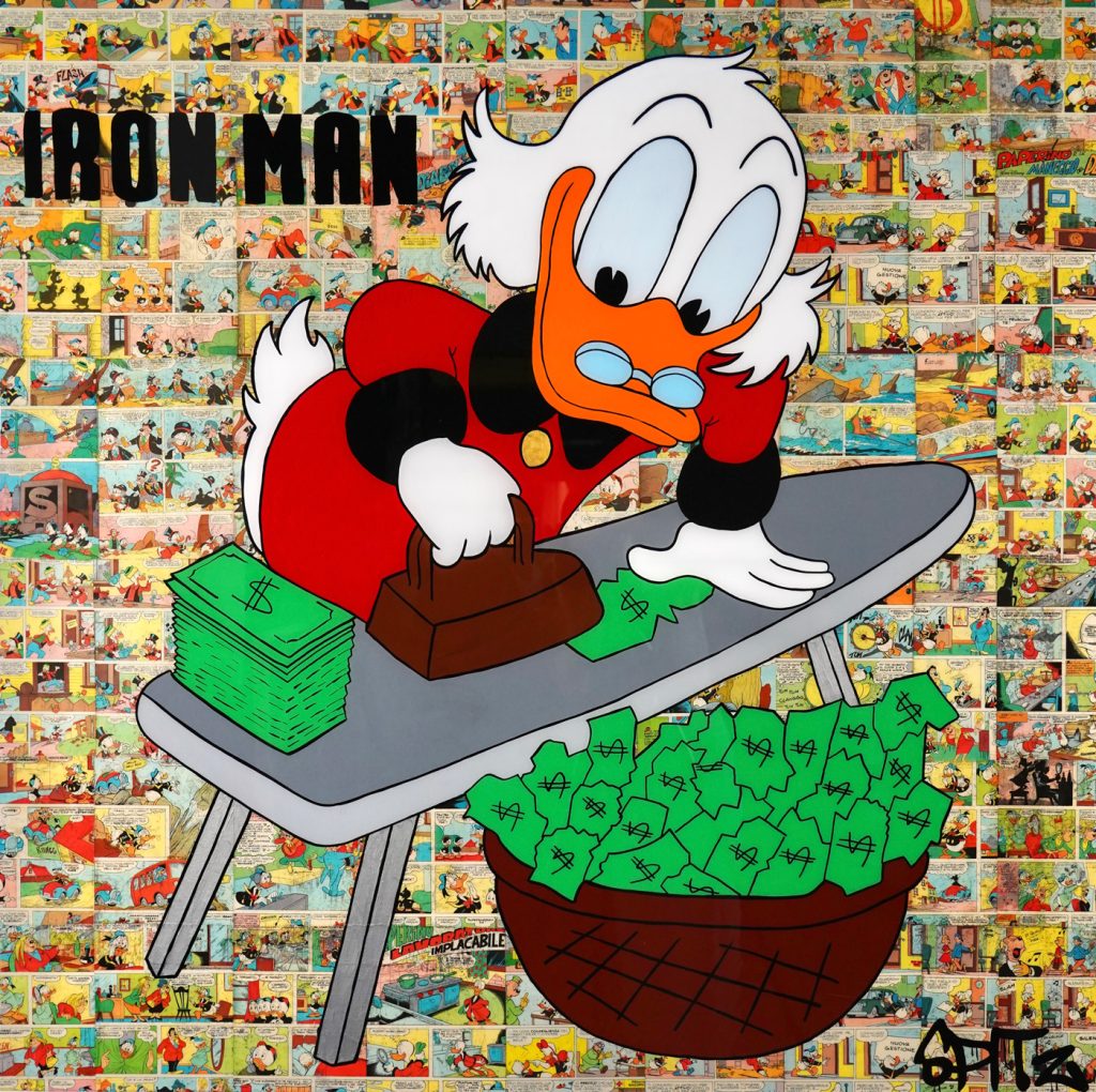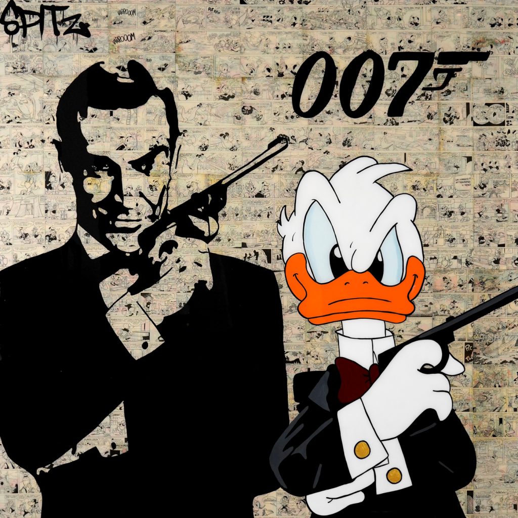 Spitz is an italian artist known to be the comics artist, even though comic-subjects only play as a background to this artworks. Since a young age, Spitz has always been a reader of Mickey Mouse, Popeye, Linus and Superman. He considers these comic books true and authentic means of communication as well as a good narrative of life, which are told in a humorous manner. His passion is to collect old magazines and to extrapolate pages that he can use in his works, on top of these, there is always a painted icon expressed in different shapes and colors. His art is a mixture of past and present of comedy and reflection on the simple every day life. His works are exhibited in various public and private locations all over the world. He likes his works to be a source of joy and inspiration for collectors and art lovers.